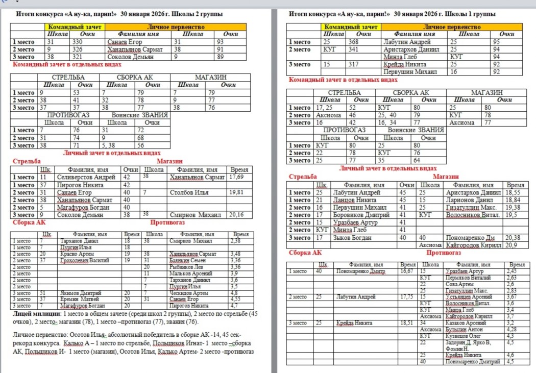 Стрельба из пневматической винтовки (командное) 1 место – школа № 25 (76 очков) 2 место – школа № 34 (61 очков) 3 место – школа № 16 (56 очко) Личники: 1 место – Третьяков Александр 47 очков (шк. №25), Сергин Артём 47 очков (шк.№35) 2 место – Мокрецов Алексей 43 очков (шк.№20) 3 место – Анников Александр 42 очка (шк.№5), Галимов Кирилл 42 очка (шк.№5), Лабутин Андрей 42 очка (шк.№25), Супрун Дмитрий 42 очка, Ярмухаметов Даниил 42 очка (шк.№34) Воинские звания (командное)